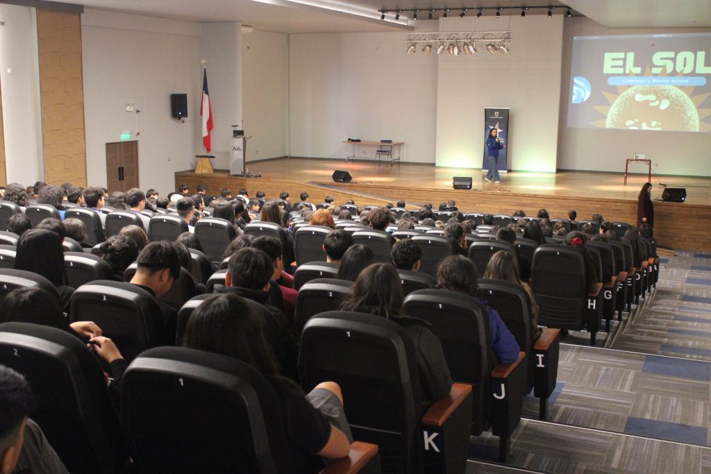 La jornada continuó con una charla masiva dictada por Fernanda Ancamil, integrante de EDA. La ponencia “El Sol, llamarada y manchas solares” se llevó a cabo en el auditorio del Colegio Angol y contó con la participación de cerca de 300 estudiantes, pertenecientes a la institución anfitriona, además de los colegios Mozart School, San Francisco de Asís Angol y del Liceo Industrial de Angol.