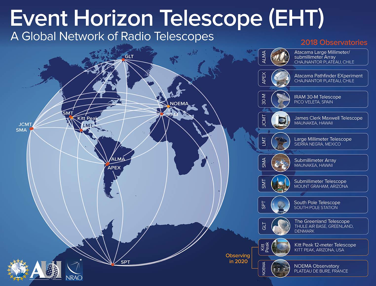 Los telescopios individuales involucrados son: ALMA, APEX, el telescopio IRAM de 30 metros, el Observatorio IRAM NOEMA, el JCMT (telescopio James Clerk Maxwell), el Gran Telescopio Milimétrico (GTM), el Conjunto Submilimétrico (SMA), el Telescopio Submilimétrico (SMT), el Telescopio del Polo Sur (SPT), el Telescopio Kitt Peak y el Telescopio de Groenlandia (GLT).